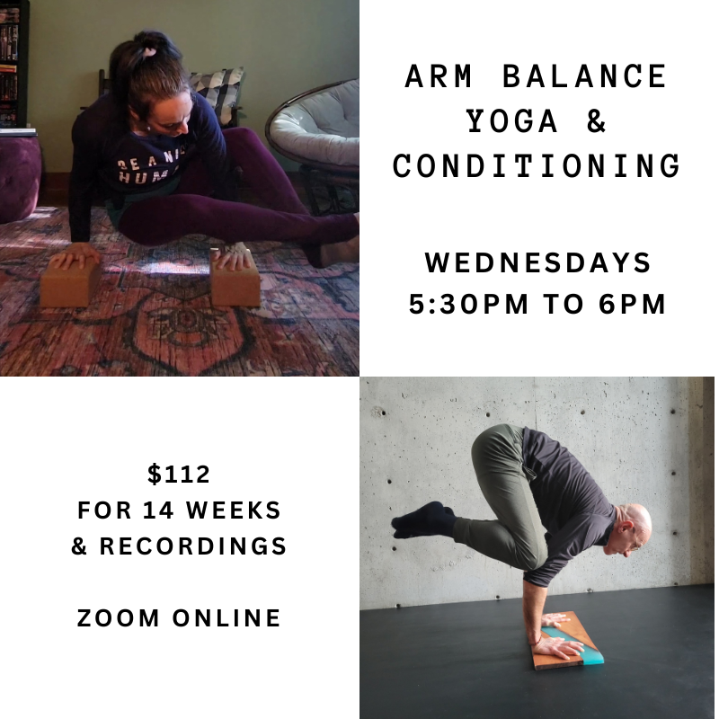 Arm Balance Yoga and Conditioning is a 30 minute Zoom class that focuses on building strength & mobility in your wrists, arms, shoulders and core.